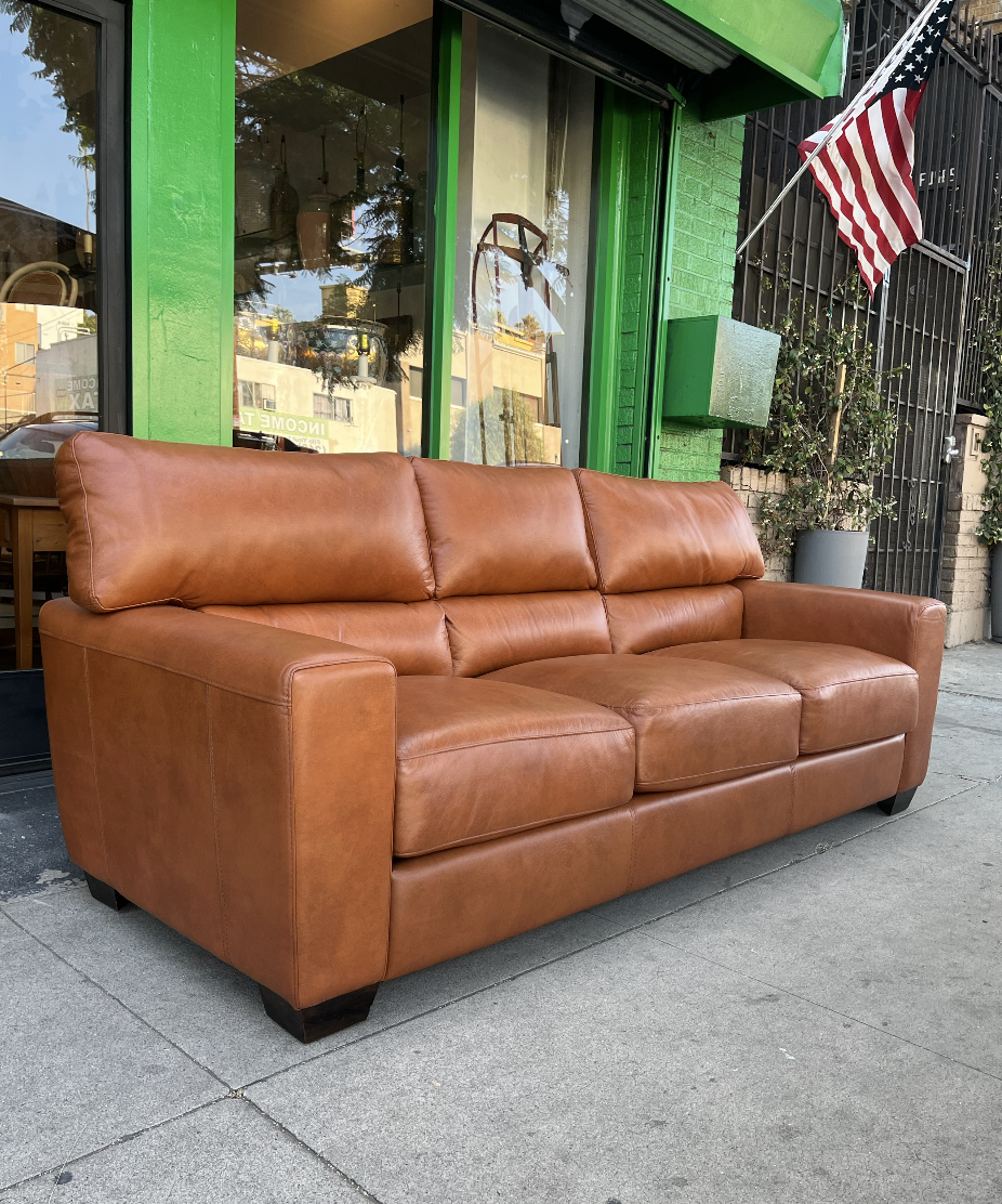 This Contemporary-style sofa is not only very comfortable but also durably upholstered in full-grain cognac leather.