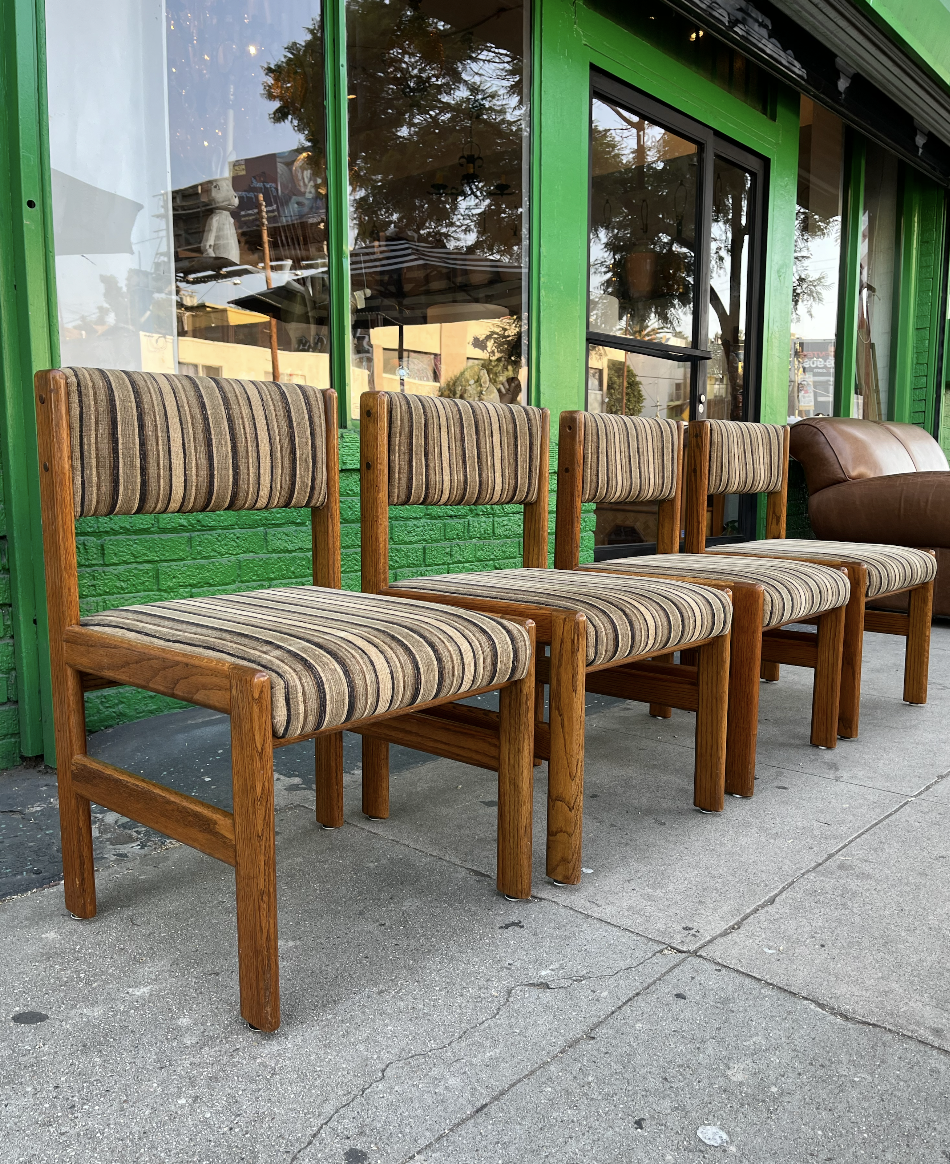 This set of four 1980s modern dining chairs comes with the original striped fabric.