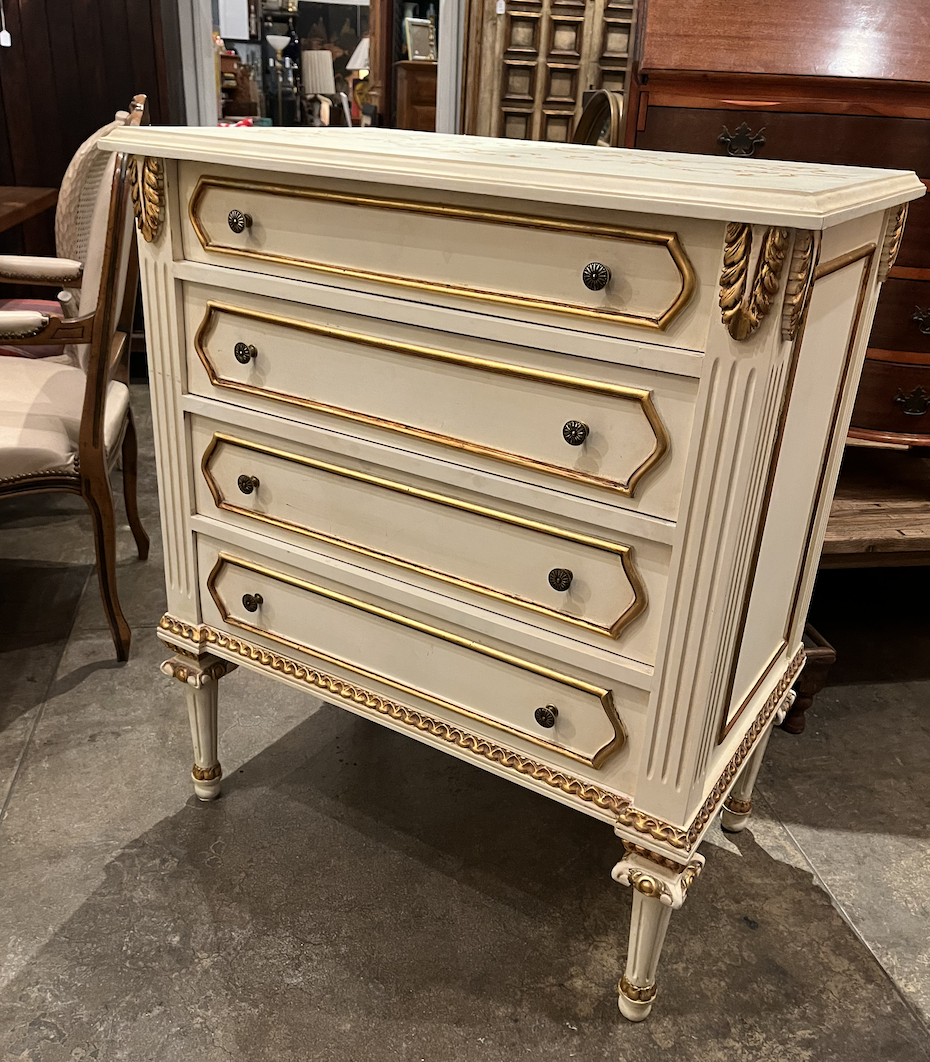 This vintage French-style dresser features four drawers and a glass top for extra protection.